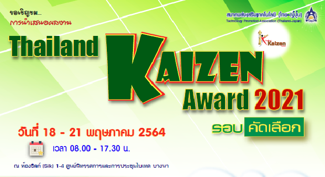 ขอเชิญชม…การนำเสนอผลงาน Thailand Kaizen Award 2021 รอบคัดเลือก สูจิบัตร Thailand Kaizen Award 2021 รอบคัดเลือก วันที่ 18-21 พฤษภาคม 2564